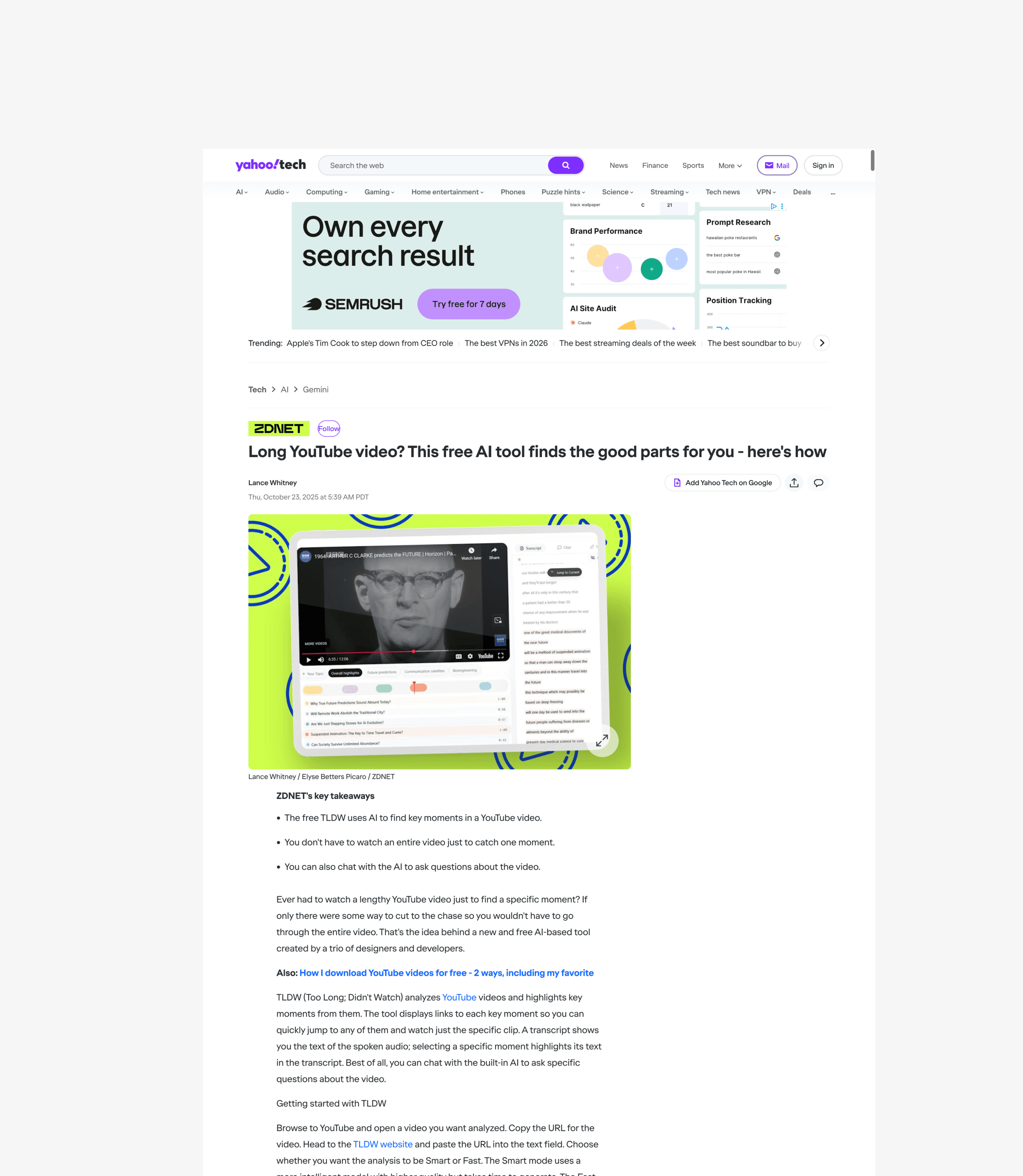 TLDW (Too Long; Didn't Watch) turns long YouTube videos into personalized highlight reels. Instead of compressing an hour-long video into a generic text summary, TLDW uses AI to surface the 5 minutes that actually matter to you — with timestamped jumps, an interactive transcript, and a context-aware chat.