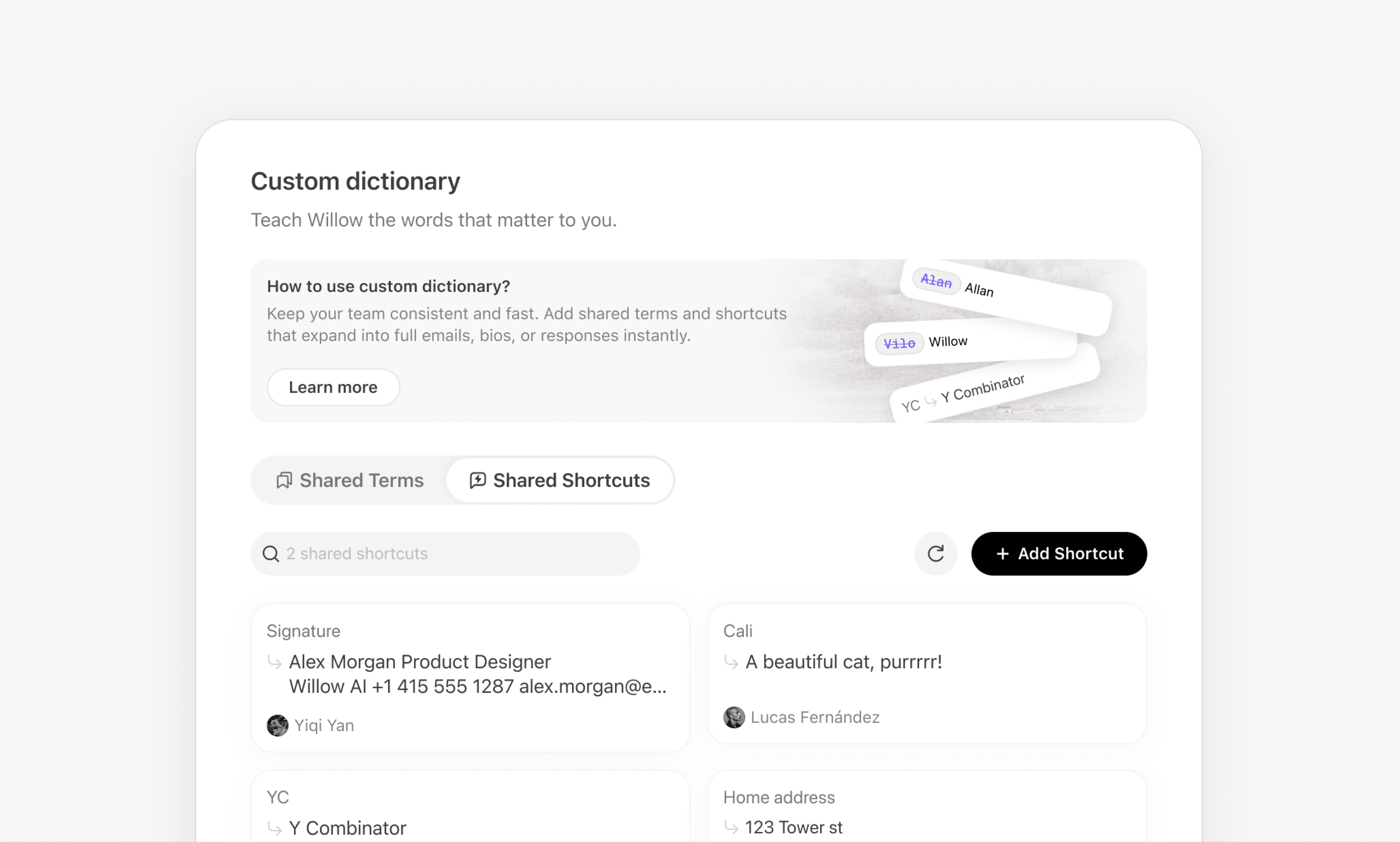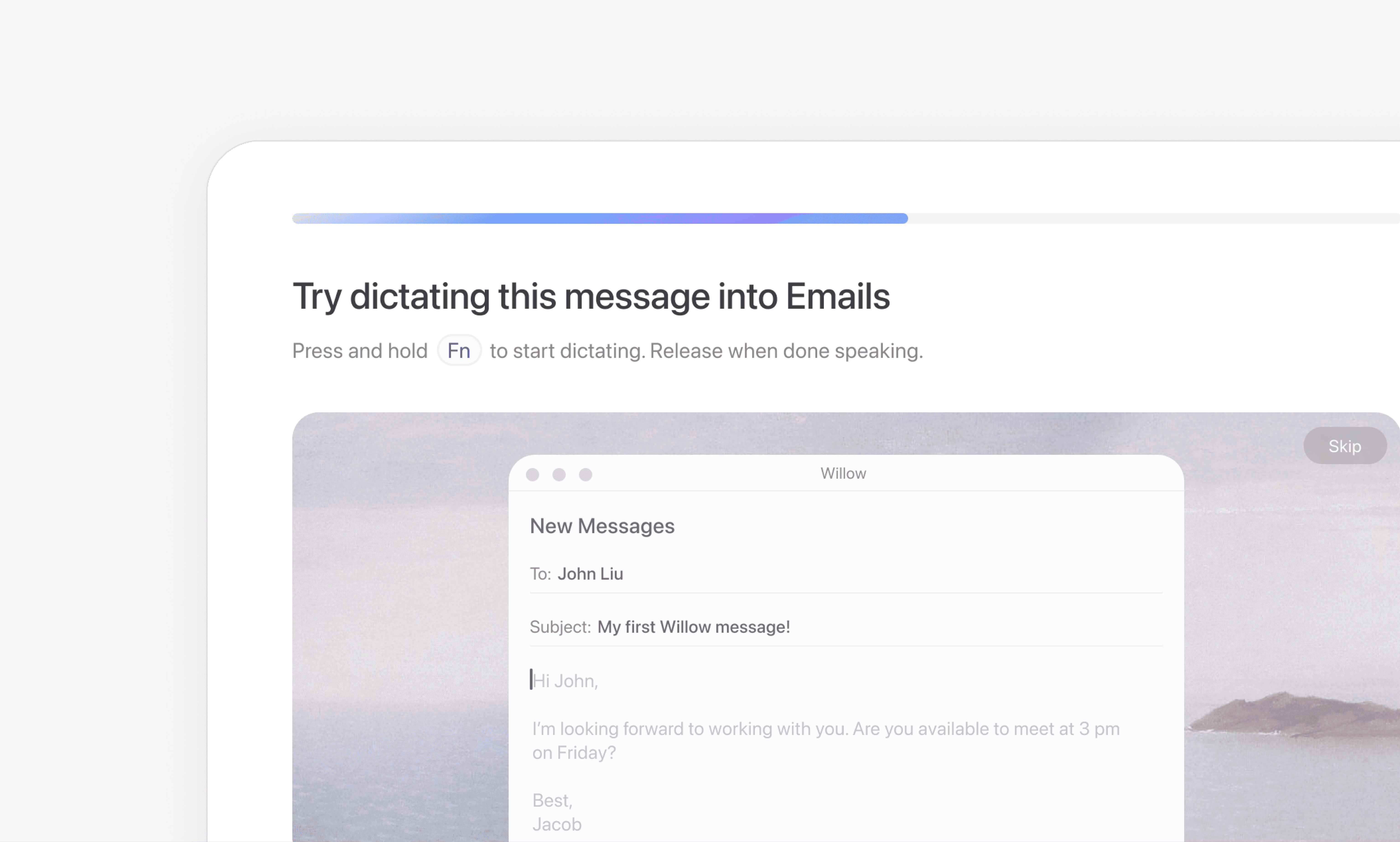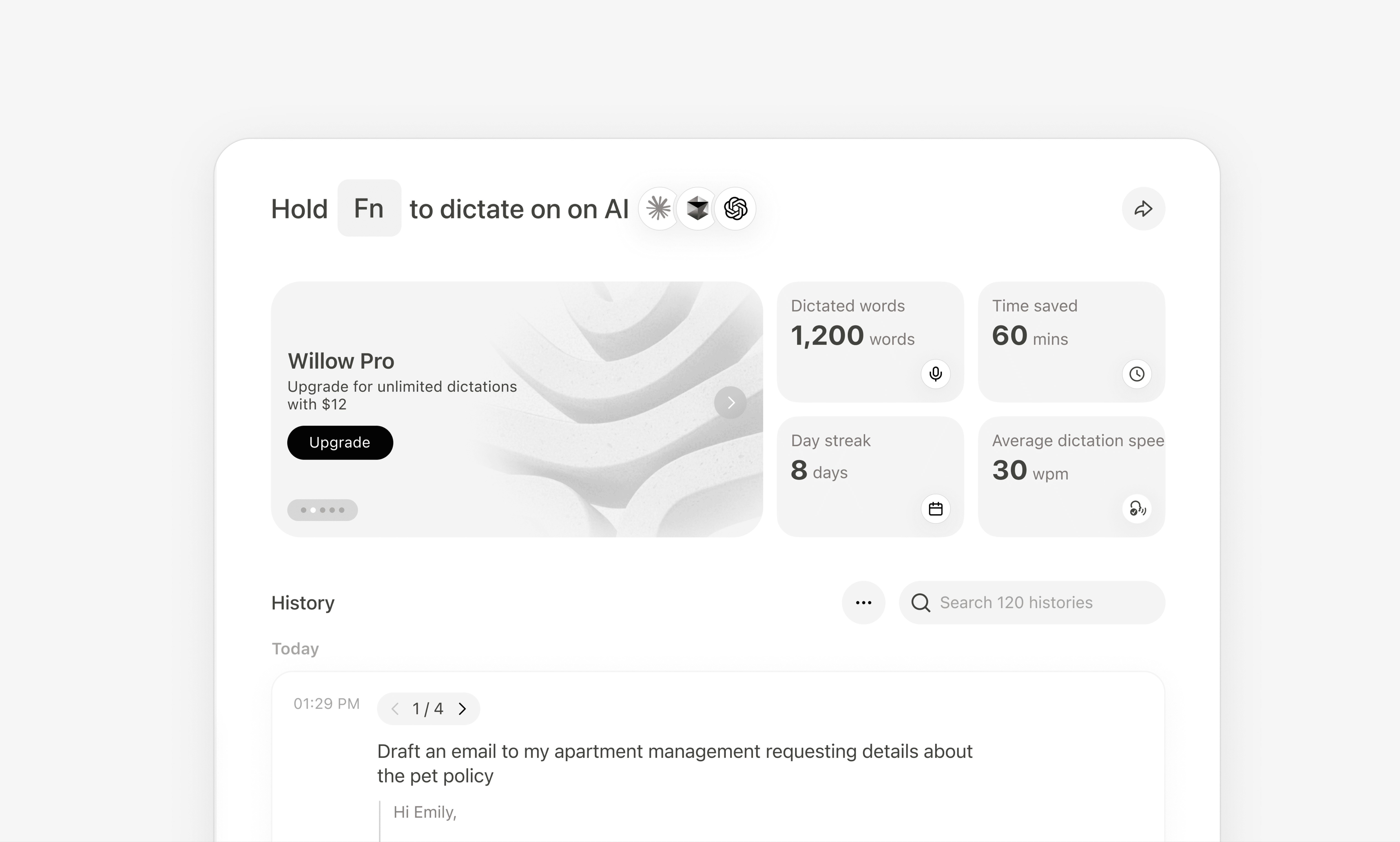 At Willow, dictation comes first. Our mission is to make voice input and AI writing tools feel effortless- integrated into the apps you use daily, so they become second nature.