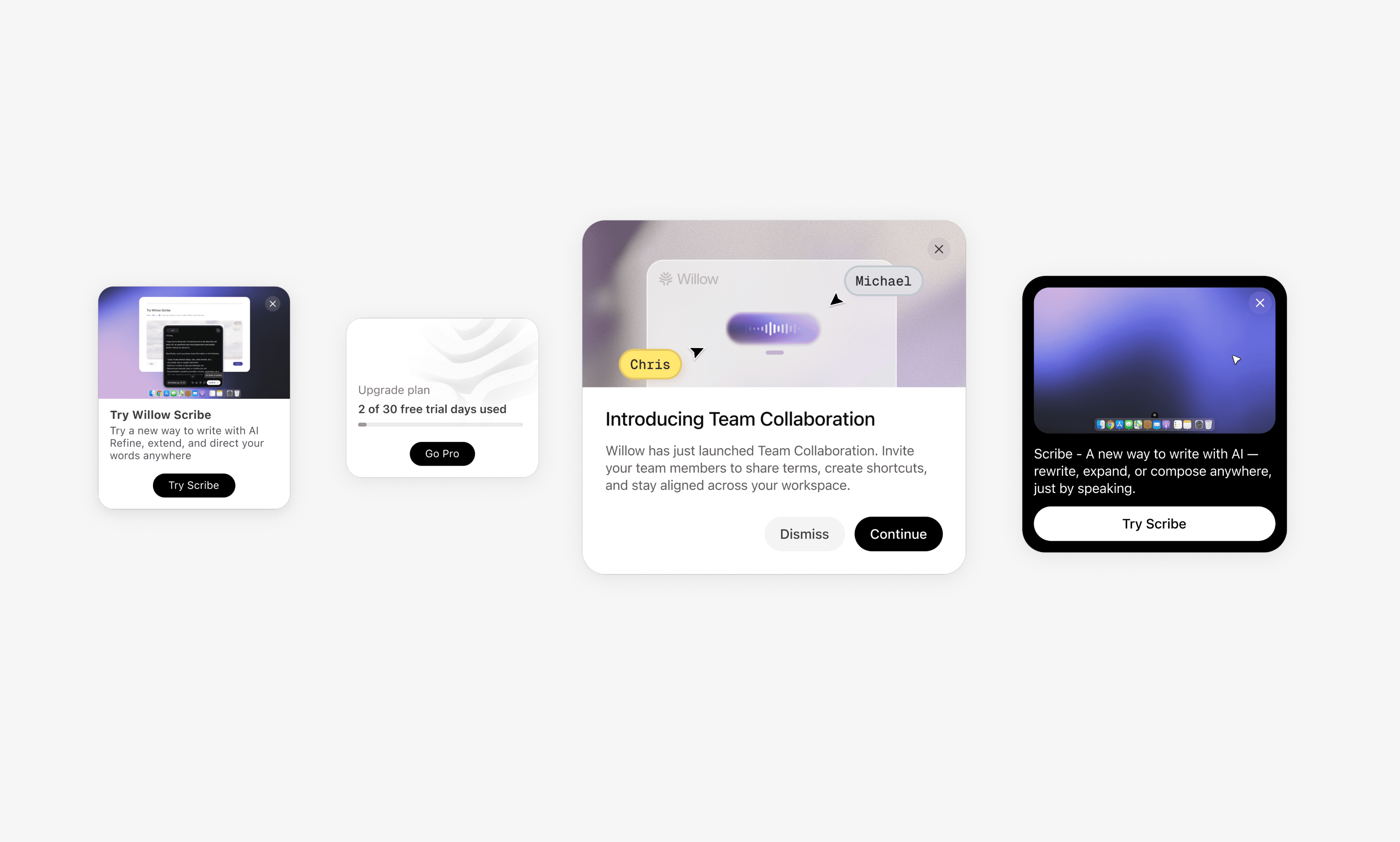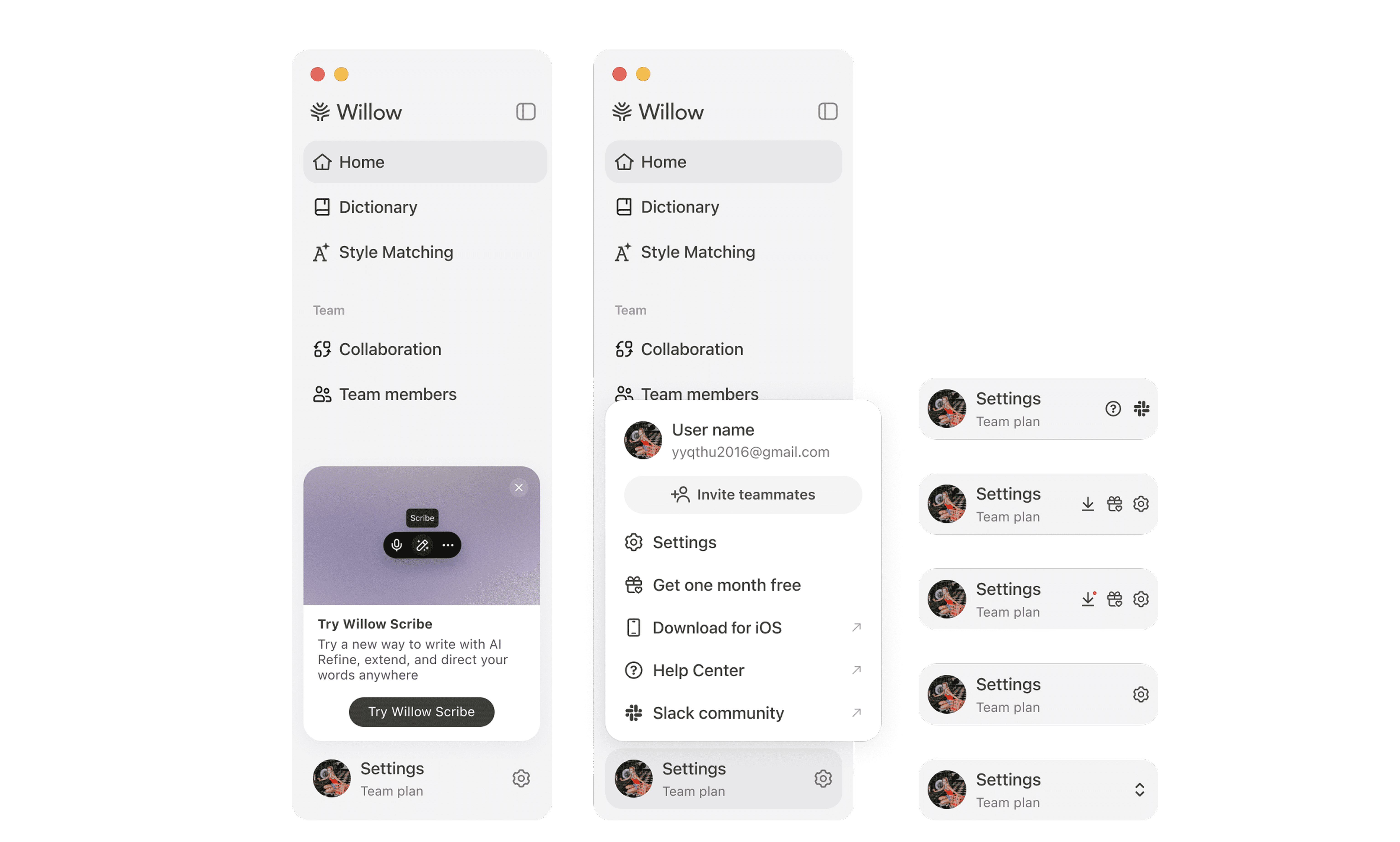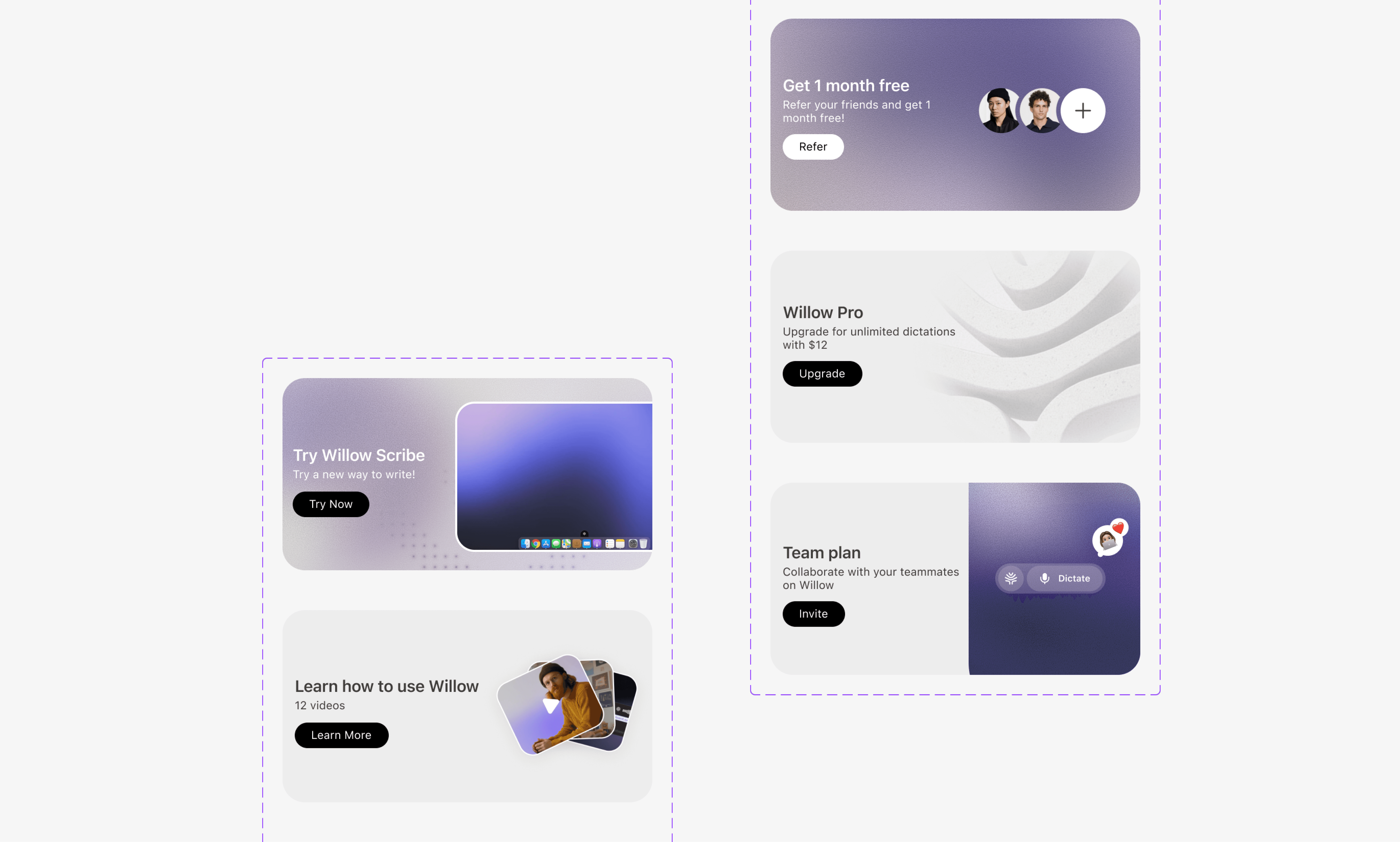 During onboarding, we guide users to correctly discover and use Willow's various dictation methods. Our in-app Education Center, paired with motivational design patterns, helps users build and retain the habit of using Willow. The main app also includes team management and friend referral features. Near the primary action area, an auto-rotating carousel and other surface-level designs make it easy for users to invite their friends.