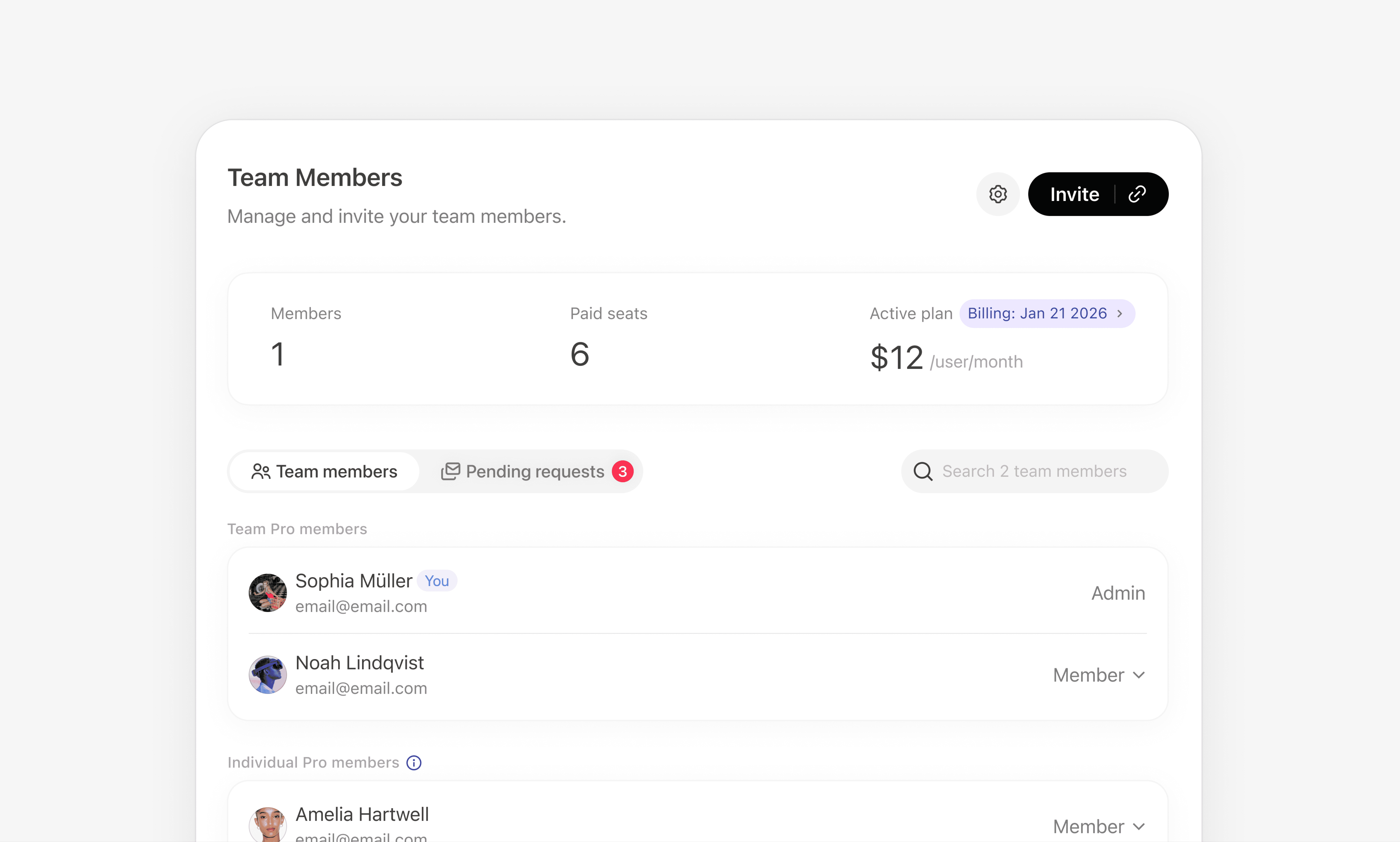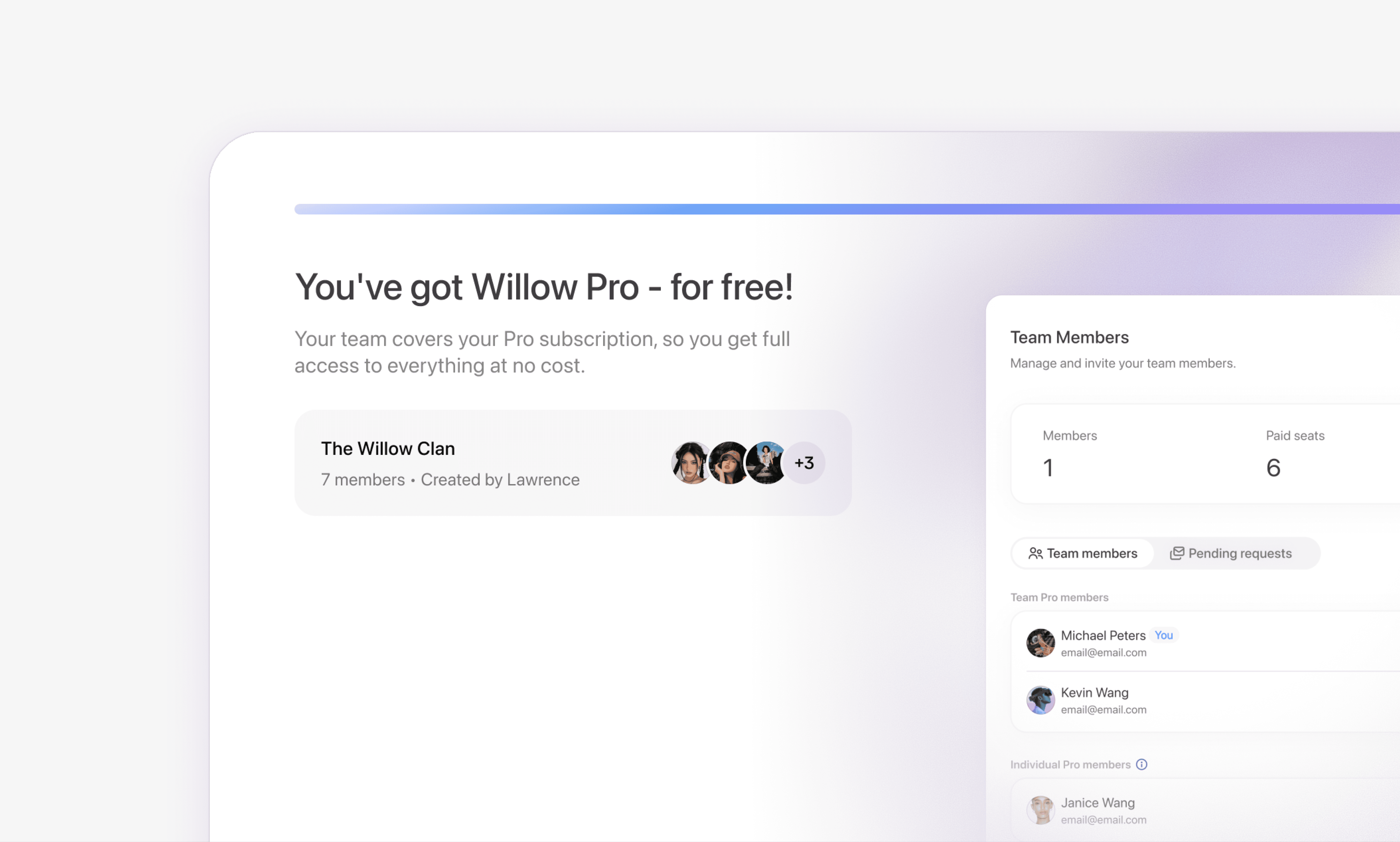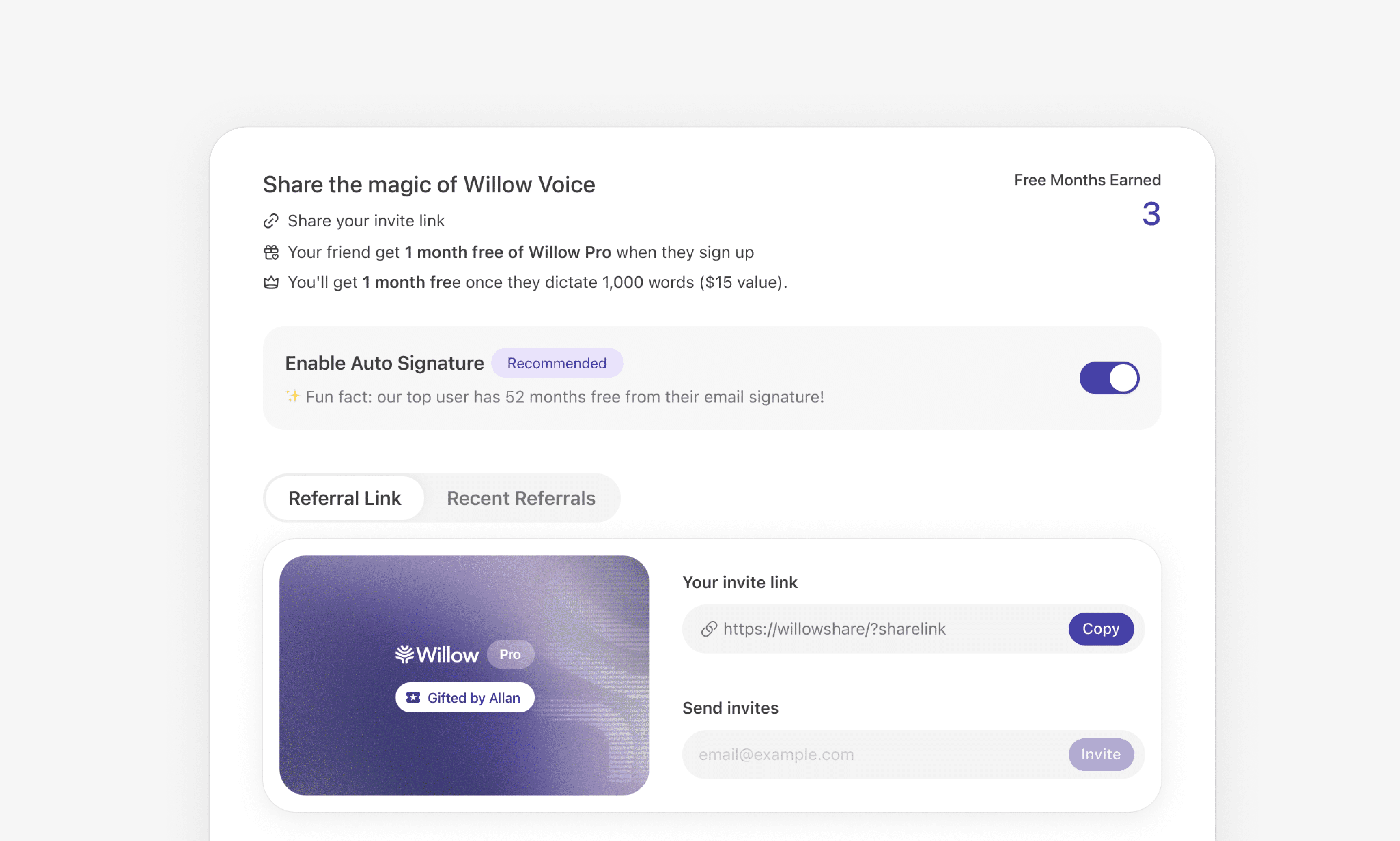 During onboarding, we guide users to correctly discover and use Willow's various dictation methods. Our in-app Education Center, paired with motivational design patterns, helps users build and retain the habit of using Willow. The main app also includes team management and friend referral features. Near the primary action area, an auto-rotating carousel and other surface-level designs make it easy for users to invite their friends.